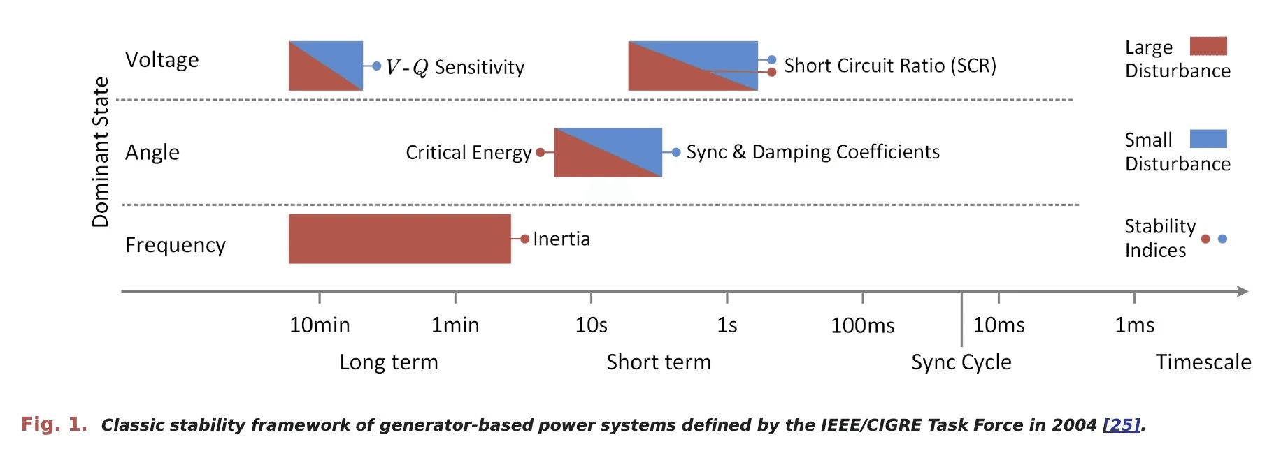 Traditional power systems, dominated by synchronous generators, classify stability mainly by three dimensions: dominant state variables (rotor angle, frequency, voltage magnitude), time scales (long-term and short-term), and disturbance levels (small and large disturbances).